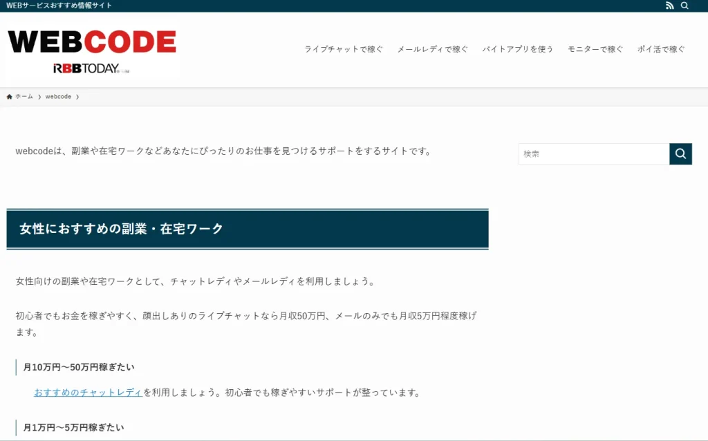 | サイト名 | WEBCODE(ウェブコード)は、女性の「自分らしい働き方」を応援する総合情報メディアです。 チャットレディやメールレディといった在宅ワークの最新ランキングや、各事務所の評判を詳しく発信しているほか、スキマ時間を活用できるポイ活、アンケートモニター、アルバイト探しに役立つアプリ情報など、女性向け副業に関する幅広いコンテンツを展開しています。 さらに、キャリアアップを目指す方に向けたバーチャルオフィスの紹介など、一人ひとりのライフスタイルや目標に合わせた「理想のお仕事探し」をトータルでサポートしてくれる信頼性の高いサイトです。 |